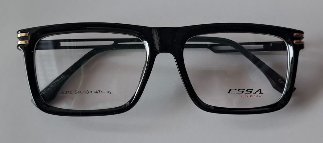 Introducing the Essa Black Full-Rim Eyeglasses, a bold and sophisticated accessory for a powerful look. These glasses feature a classic rectangular frame with a striking glossy black finish. The design is elevated by distinctive golden metallic stripes on the hinges, adding a luxurious and modern touch.
